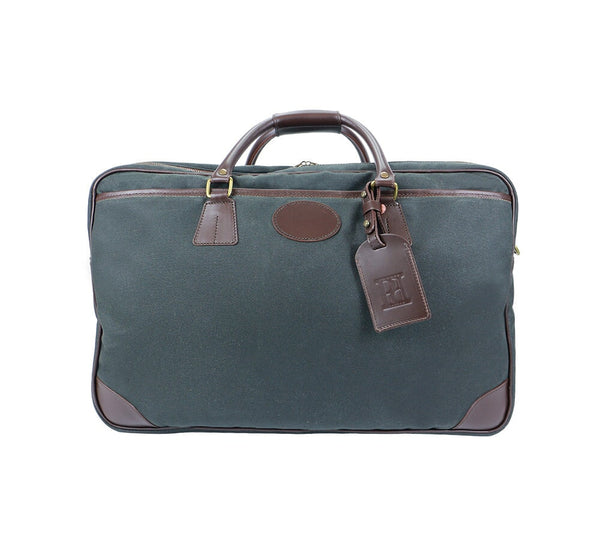 Handmade in England, this compact business travel bag is classically crafted using heavy gauge *waterproofed canvas with a contrasting **bridle hide leather trim. The bag has one external slip pocket and two separate zipped compartments; one opening fully as a suitcase, whilst the other opens into a briefcase with pen loops and business card pockets, providing an ideal hybrid of business and travel bag functionality.