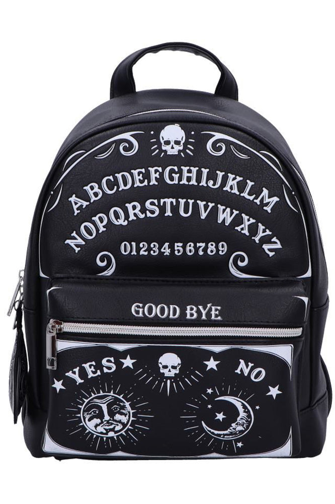 This backpack features the iconic black and white spirit board artwork prominently displayed on the front. It includes a spacious main zip compartment, a small zip compartment inside for added organization, and additional compartments on the front and back for convenience. Adjustable straps ensure a comfortable fit for daily use.
